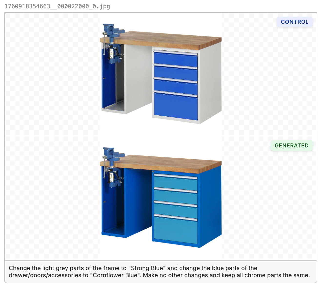 Recently, we had an AI-native consulting firm named AlliumAI come to us because needed to generate a catalog of furniture. The product catalogue had a variety of items such as desks and cabinets and different color swatches that needed to be used for these items.